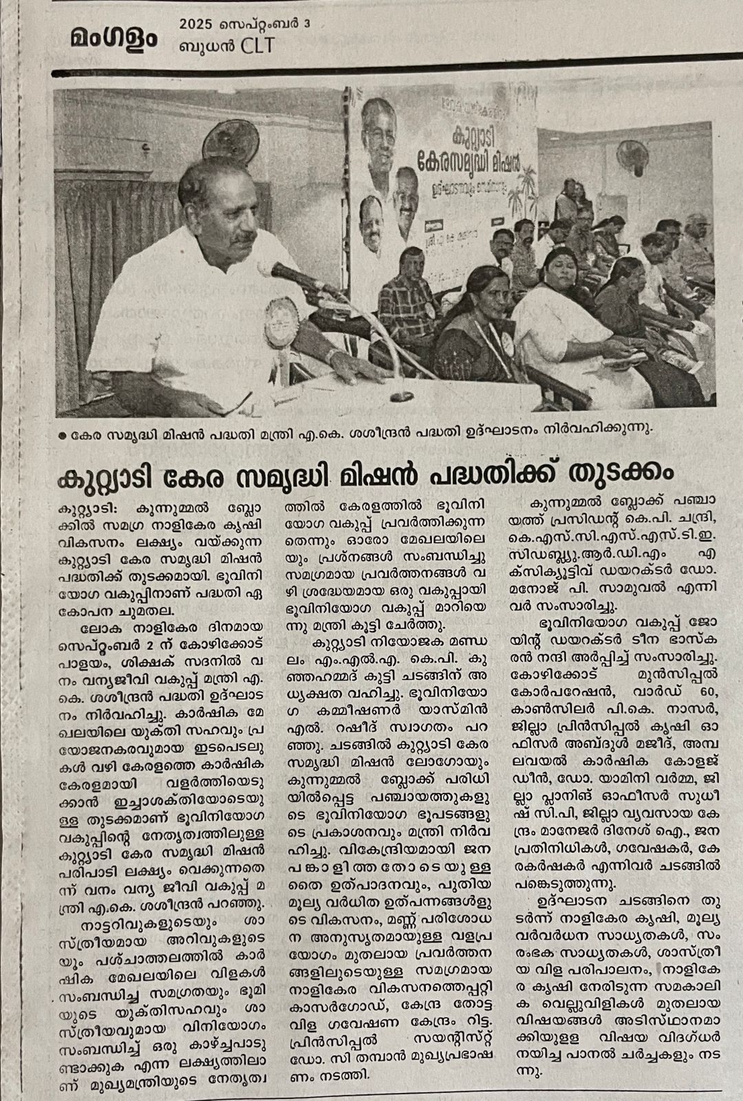 കുറ്റിയാടി കേര സമൃദ്ധി മിഷൻ ഉദ്ഘാടനം: ശ്രീ. എ. കെ. ശശീന്ദ്രൻ (ബഹു. വനം വന്യജീവി വകുപ്പ് മന്ത്രി) നിർവ്വഹിച്ചു . 02.09.2025